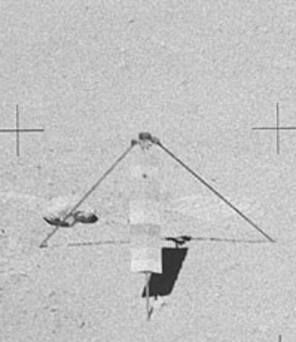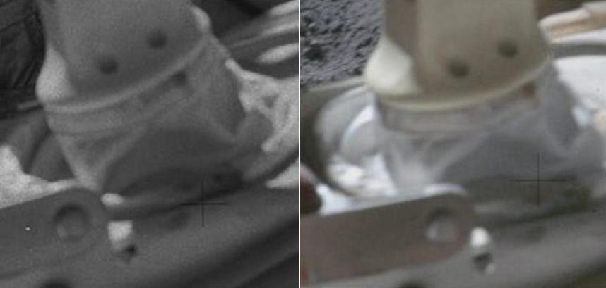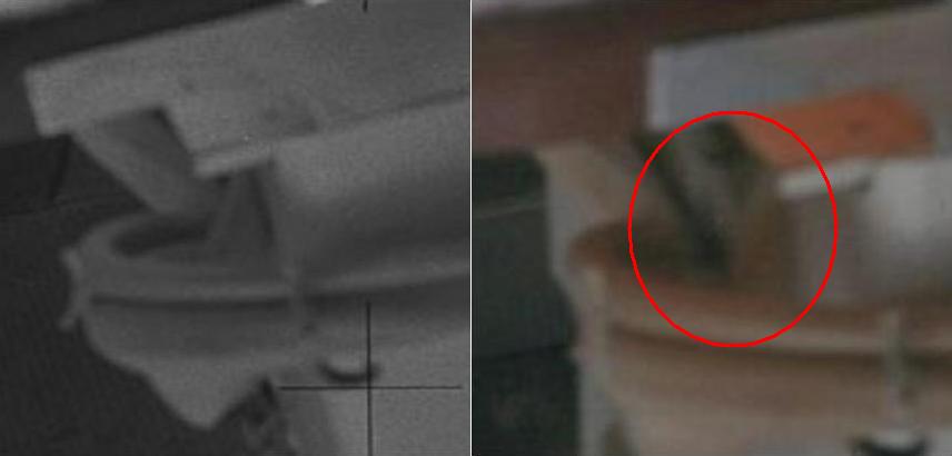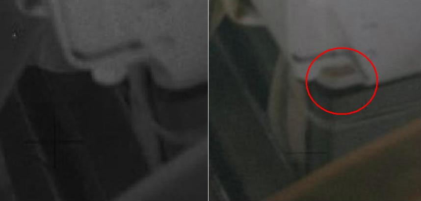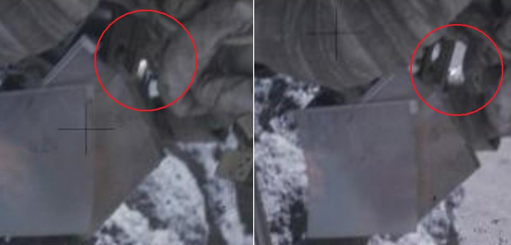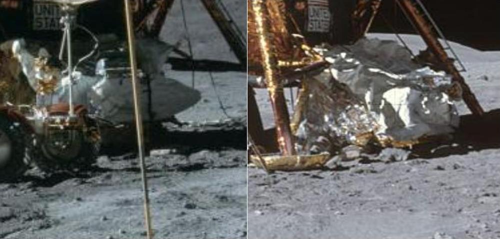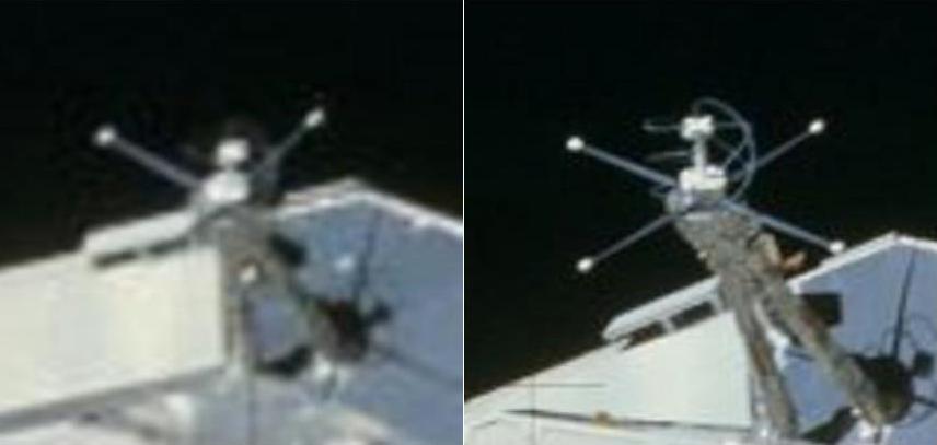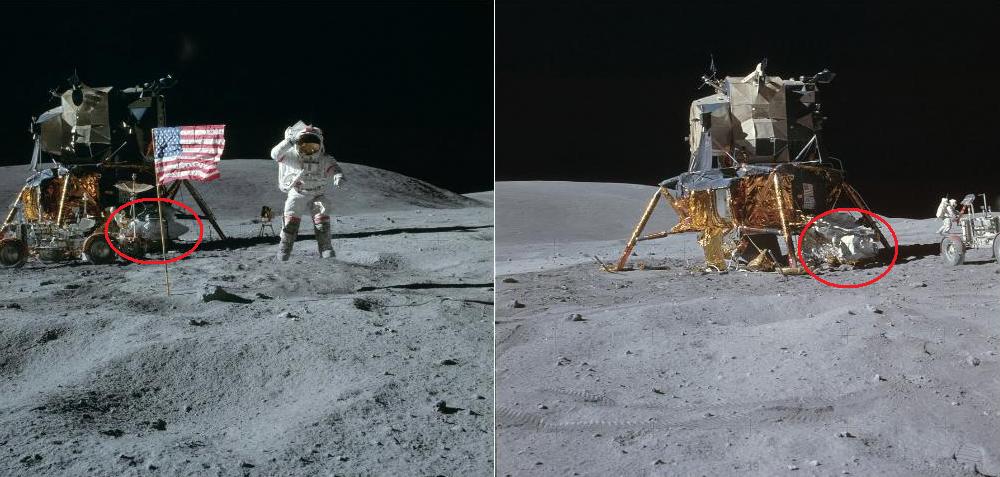 ![]() On photo AS16-116-18718, there is an object on the reflection of the solar battery (I have circled in red) which is absent on the reflection of the photo AS16-116-18719! ![]() One could say that if the object has disappeared, it's because of the change of angle of view, but it's not the case: - Look how the object I have circled in red is positioned above the two solar cells planes which are under. On the second photo, this object has pivoted and should still be visible; a part of it is still visible, but a good part of it has vanished. - On the first photo, the right side is red; on the second photo, we see the part of this side which is beyond the second solar cells plane; this part is red on the first photo, but not on the second one. - On the top of the photos, we see a couple of wires; one is straight on the first photo, and bent on the second one. |