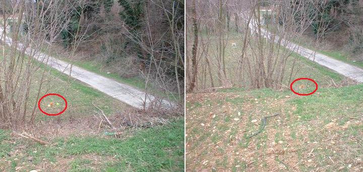 ![]() But if we draw a (red) line from the magnetometer, we can see that it cuts the shadow of the photographer differently; relatively to the magnetometer, the shadow has moved on the left. If the photographer had only made a rotation with his camera, the red line should cut the shadow the same way; but we can see that there is a stone near the ribbon and closer to the photographer which has moved on the left relatively to the magnetometer; it indicates that the photographer has moved on the right, and, if the photographer has moved on the right, not only his shadow should not have moved on the left relatively to the magnetometer, but it should even have moved a little on the right! |