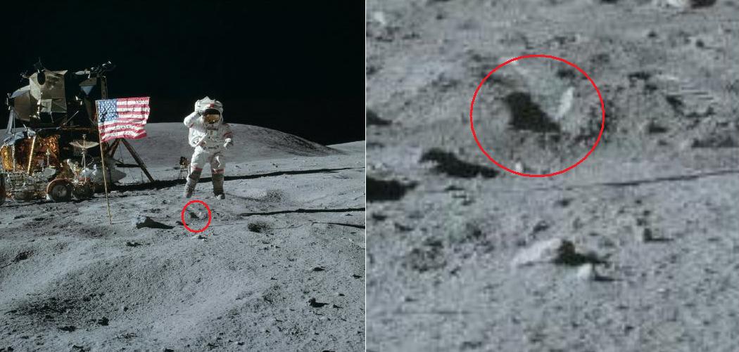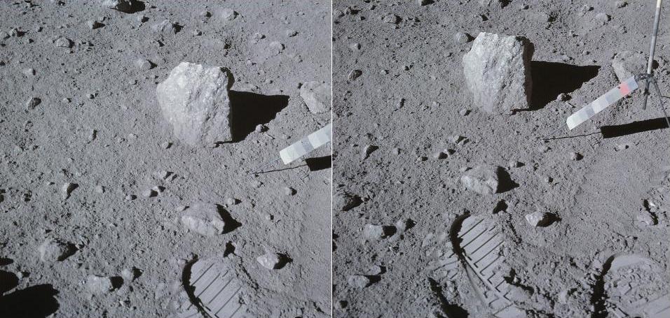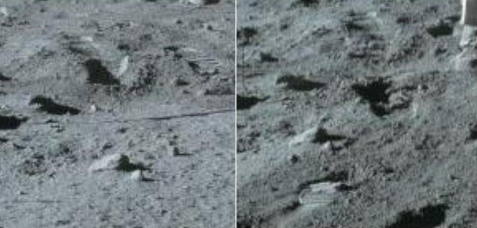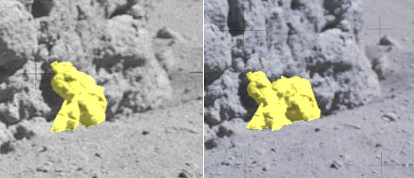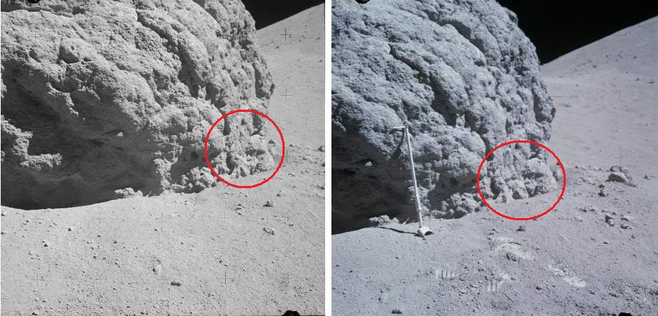 ![]() On photos AS16-106-17415 and AS16-117-18729, we have two views of a rock. ![]() But if we take a close-up at the bottom of the rock, we see something abnormal. You don't see it? ![]() Let me help you. The parts I have colored in yellow are different on the two photos (and weird too!). |
