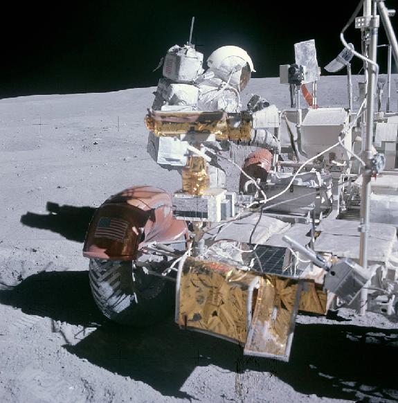 ![]() On the photos AS16-108-17622 and AS16-108-17623 we can see something written on the backpack of the astronaut, but I can't make out what it is. Can you? |