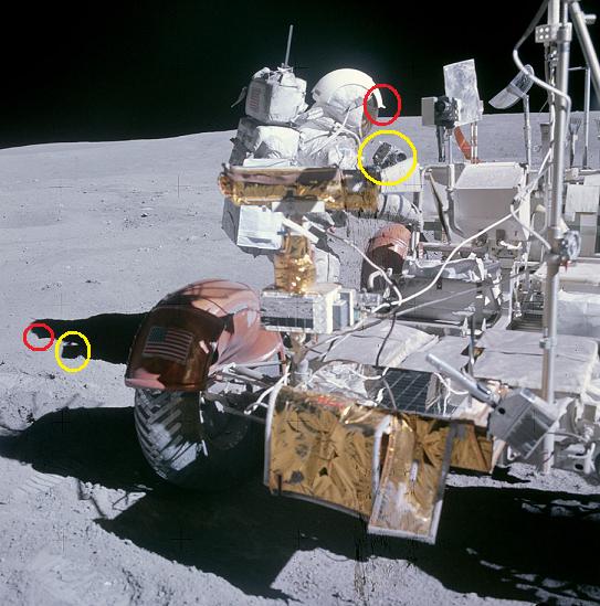 ![]() On the photo AS16-114-18453, the shadow of the astronaut appears inverted: It is looking toward the rear of the rover whereas the astronaut is actually looking toward the front of the rover. We can indeed see the shadow of the helmet's edge over the visor (circled in red) and the shadow of the camera the astronaut is holding (circled in yellow). ![]() On this photo, I have corrected the shadow of the astronaut so that it is oriented the same way as its owner. Notice however that the orientation of the helmet's edge is not quite correct. |