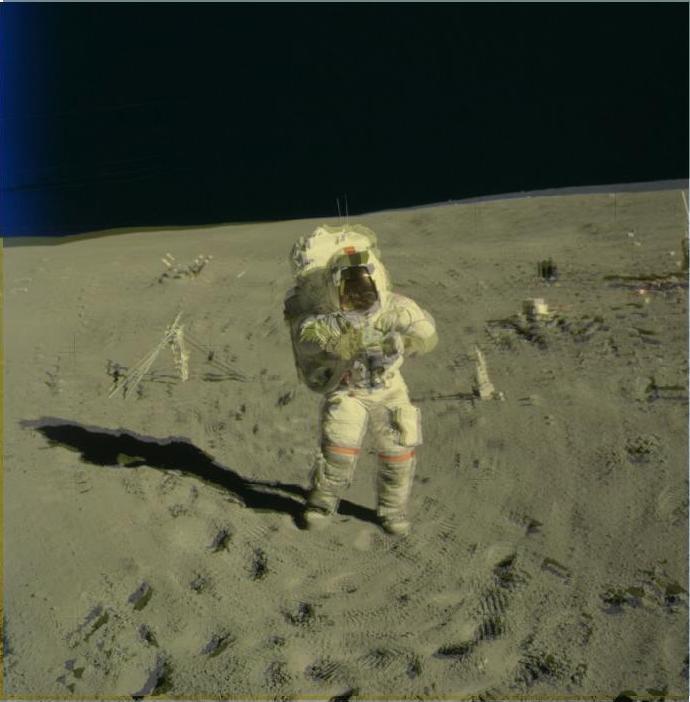![]() This is a part of photo AS16-108-17702. The top of the astronaut's shadow is obviously incorrect. |