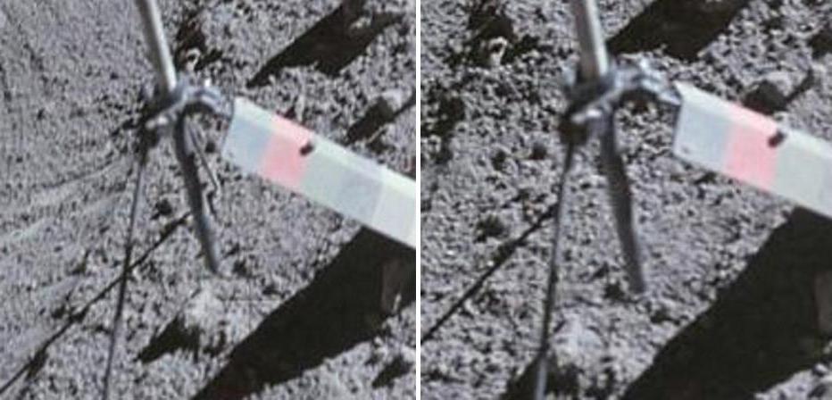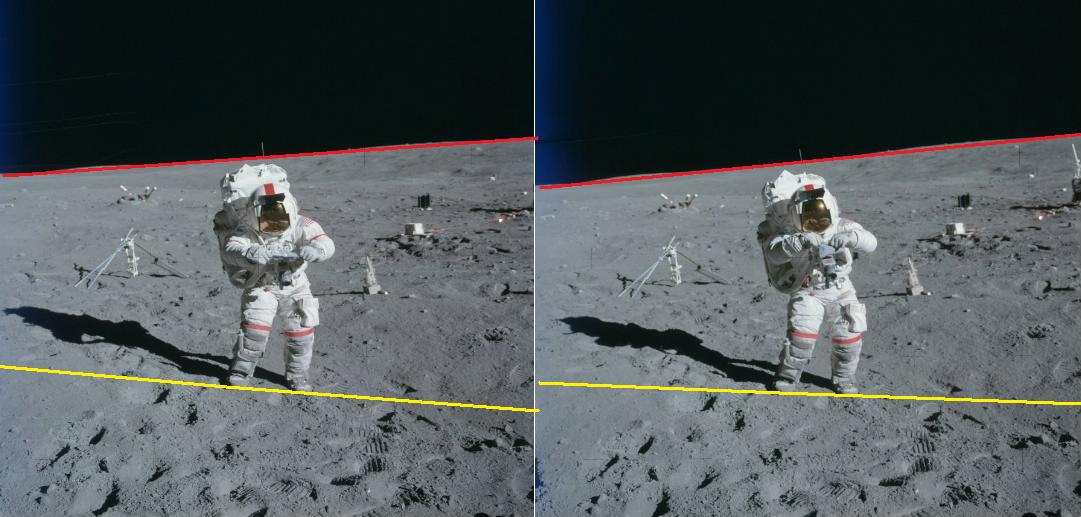 ![]() On photo AS16-113-18374 (right), the magnetometer in the close foreground has slightly moved on the left relatively to the ALSEP; the photographer has moved on the right, and the ribbon should have rotated clockwise relatively to the (yellow) horizon line, but it has rotated counterclockwise instead. Background and foreground rotating in opposite directions, the very favorite of the fakers, the most used trick! |