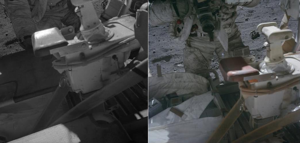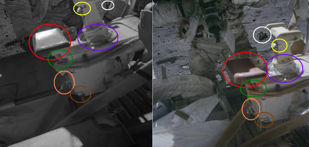 ![]() There are two close-ups of the rover with an astronaut on the side of the rover: AS16-108-17744 (left on the double view) and AS16-115-18472 (right on the double view). ![]() On this double view I have circled with different colors several parts worthy of interest. ![]() This double view shows close-ups of a part of the photos on which we can see a weird rock (circled in white on the general view). This rock has a very strange shape; it allows to know how the photographer has moved between the two views, by locating this rock relatively to the rover on the two views: The photographer has moved up and on the left. ![]() This double view shows close-ups of the saddle on the two views (that I have circled in red on the general view). By examining the shadows, we can see that the sun is shining from the rear; on the second view, the way the saddle is lit seems logical; but on the first view, the part of the saddle which is brilliantly lit is the left part of the saddle; it's illogical, given the way the sun is shining (from the rear); moreover we can see that the left side of the rover is in the shadow, and there is some light on its right side. ![]() This double view shows close-ups of the bottom of the handle of the two photos (that I have circled in violet on the general view). We can see that the foot of the handle is lower on the second view that it is on the first view. ![]() This double view shows two close-ups of a marking on the handle (circled in yellow on the general view). We can see a 'R' on the right of a dash. Of the left view, the 'R' is as thick and clear as the dash. On the right view, may be the top of the 'R' is hidden by the handle, but we can see its bottom, and it should be as thick and clear as the dash, but it isn't; it's half erased. ![]() These are close-ups of what's under the saddle (circled in green on the general view). On the right view we can see an element (I have circled) which is absent of the left view. ![]() Still lower there is a metallic ring (circled in orange on the general view) of which I show close-ups on the two photos. On the second photo, the metallic ring is doubled with a second smaller ring (I have circled) we can't see on the first photo. ![]() On this double view, I show close-ups of the bottom of the white plastic box (circled in brown on the general view). On the left view we can see an element (I have circled) which is absent on the first view. ![]() I have circled other parts on the two photos which are also worthy of interest. ![]() On this double view, I show close-ups of a vertical lever which is connected to the white box (circled in yellow on the new general views). Obviously, the purpose of this lever is to be turned, probably to change gear). But see how it is fixed! How can it turn the way it is fixed??? ![]() Finally, the cherry on the cake: On the second view, the astronaut has removed a cover which was hiding electronic devices (circled in red). I show here a close-up of these devices. We can see a small oscilloscope and an electronic measure device. Both have small displays and are less than ideally placed for the visualization. What might these electronic devices be useful to, but, most important, How could the astronauts see their display when they couldn't even see their cameras??? |