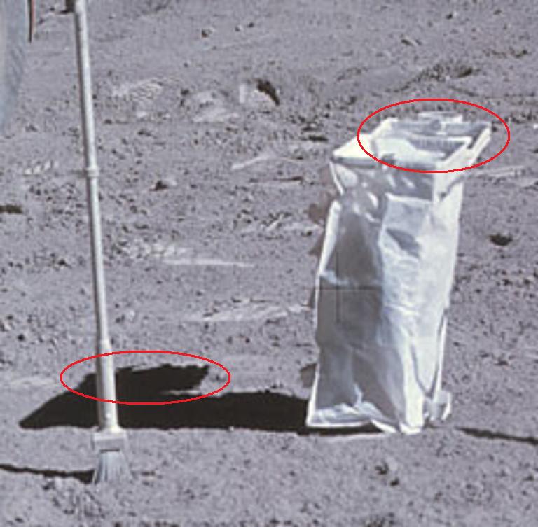 ![]() This is a part of photo AS16-107-17537. On this photo we can see a sort of bag and its shadow; the shadow of the part of the bag I have circled is incorrect; its shadow is too thick. |