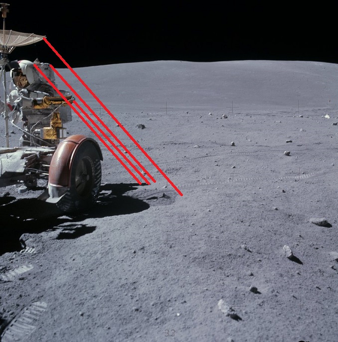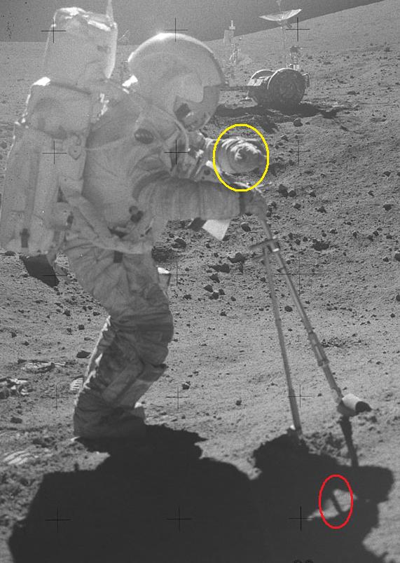 ![]() This is a part of photo AS16-110-18019. On the photo, the upper end of the brush the astronaut is holding is quite lower than his head...but the upper end of the brush's shadow comes as high as the astronaut's head! |