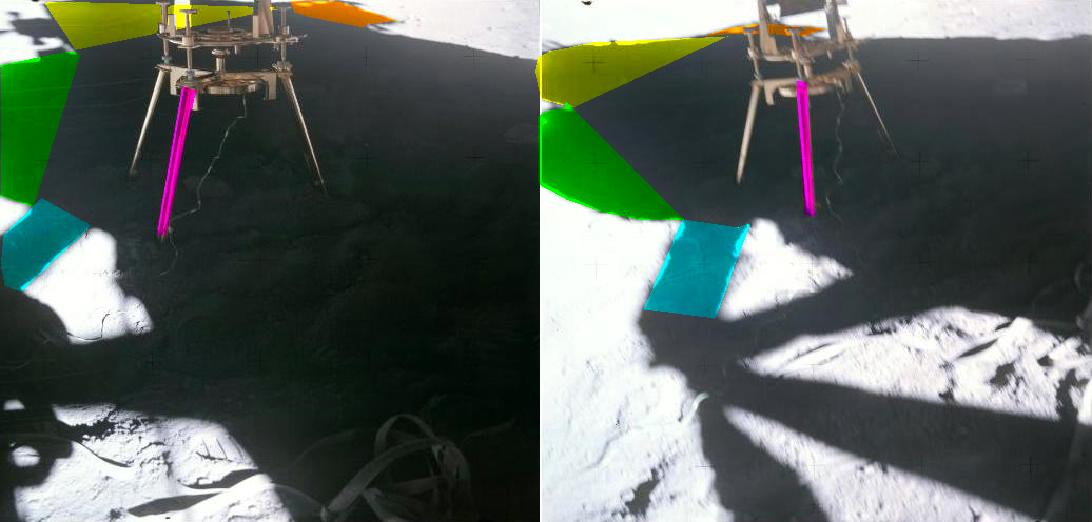 ![]() On the photos AS16-114-18437 and AS16-114-18438, the tripod is in the shadow of the LEM. But there are windows which are lit. On the first photo, the lit window which is near the tripod has the shape of a trapezium, and on the second photo it has become a triangle! The two views are taken under different angles, but the parts of the lem's shadow are recognizable. ![]() I have colored various parts of the lem's shadow with different corresponding colors. I have also colored the tripod's leg which points to the base of this window; the tripod has not been moved between the two photos. The two photos immediately follow each other, the sun has not changed between the two photos (besides the sun moves more slowly on the moon than it does on the earth - remember the lunar day is almost one month long). |