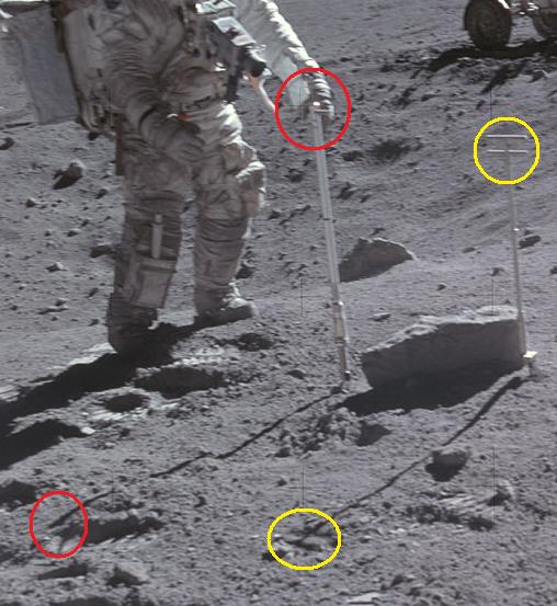 ![]() This is a part of photo AS16-107-17526. On the shadow of the stick the astronaut is holding, we don't see the shadow of the astronaut's hand at the end of this shadow. You might say: Are you sure that it is really the end of this shadow, that it is not interrupted? Yes, I'm sure it's the end of its shadow for the following reason: On the right of this stick there is another stick which is just a little smaller, and we see its shadow which is a little shorter than the first stick's shadow. And we can be sure of the end of the shadow of the second stick, for we can see the shadow of the transversal double bar which is at the top of this stick. |