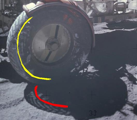 ![]() On this photo, AS16-117-18818, we can also see lit parts on the shadow of the wheel because of the open mesh wire of the tire tread... ![]() I have drawn in yellow the separation between the part of the tire which rolls on the ground and the lateral part of the tire, it is easy to locate the shadow of this separation on the ground, for the opaque bars are not oriented the same; those which are on the side are radial. And we can see that the shadow of this separation is not correct, for it arrives incorrectly relatively to the shadow of the fender. |