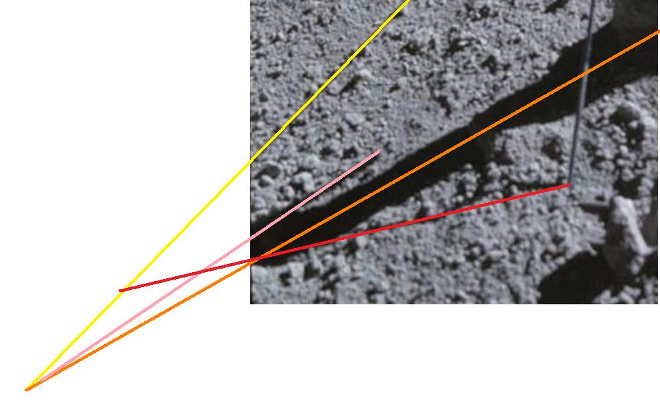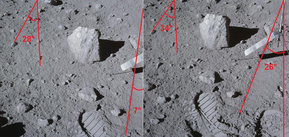 ![]() On photo AS16-108-17700 (right), the shadow of the astronaut diverges from the shadow of the rock and the one of the vertical stick; his lateral position is quite close to the one of the rock, so there is no reason that his shadow would consistently diverge from the one of the rock (which doesn’t diverge very much from the one of the stick). |