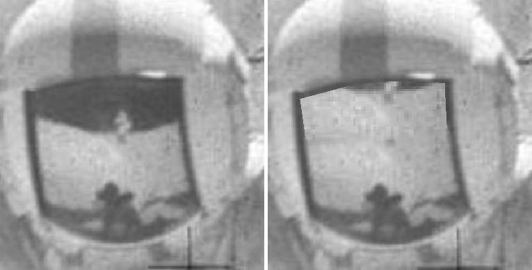 ![]() On this photo (AS16-106-17336), the photo is taken from up, but the astronaut who is photographed is not looking up. Therefore we should not see the photographer in the reflection of his visor, or only on the extreme top of it...Yet we see him, not far from the middle of the visor (I have circled him in red)! ![]() On the view of the left, I show how the photographer appears on the visor, and, on the view of the right, I show the only way he could have appeared (supposing that he even appeared at all!). |