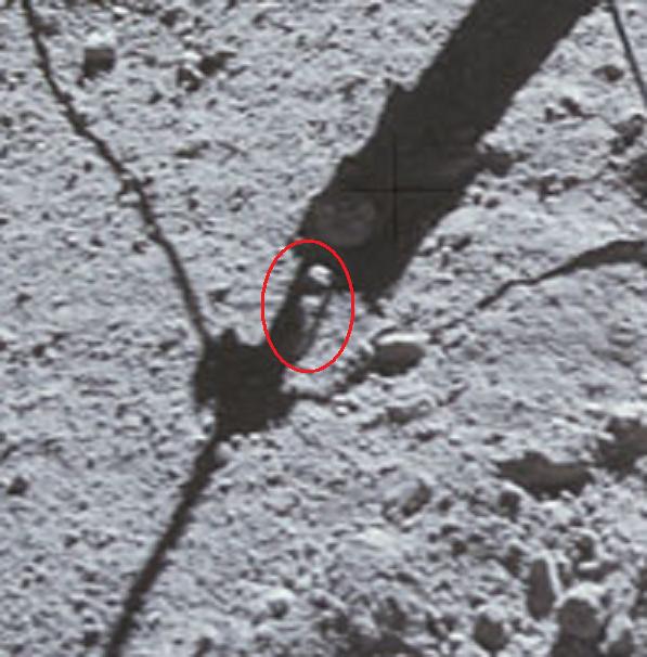 ![]() On photo AS16-107-17441 (photo on the left), we see a lunar probe which stood up after the touch down. On the photo AS16-107-17442, we have turned around this lunar probe. In the zone I have circled in red, and of which I show a close-up in a window, we can see a triangle which is around the lunar probe, and which is totally useless. But, what is really surprising is that we can see a bent nail which goes through the lunar probe; it has no function in this lunar probe. |