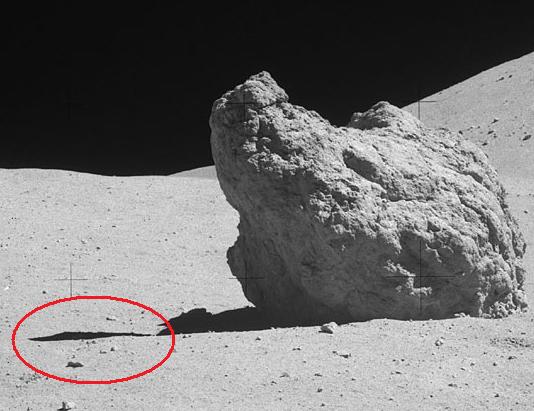 ![]() This is a part of photo AS16-106-17393. The bit of shadow I have circled is inexplicable. It can't belong to the rock's shadow. |