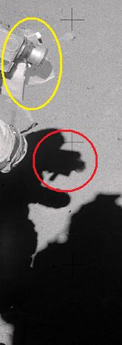 ![]() This is a part of photo AS16-110-17948. On the shadow we can perfectly see the shadow of the camera's lens. But on the photo itself, we can see that there is a paper behind the camera (or what looks like one), and we can even see the shadow of the camera's lens on this paper; therefore, it's not the shadow of the camera's lens we should see on the "lunar" ground, but the shadow of this paper. |