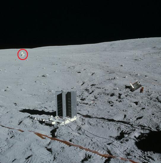 ![]() On photo AS16-113-18359, when we take a close-up at the lem in the distance, it looks like it was sinking in a lunar ocean; yet on other photos, it's not hidden by the relief. |