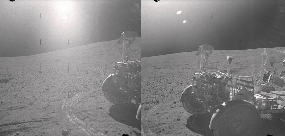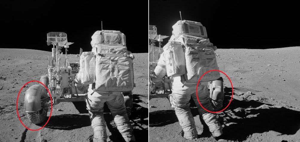 ![]() On the photos AS15-107-17437 and AS15-107-17438, we can see the astronaut move behind the rover. ![]() But if we take a close-up at the scene, we can see that the astronaut is broader on the second photo than he is on the first photo. |