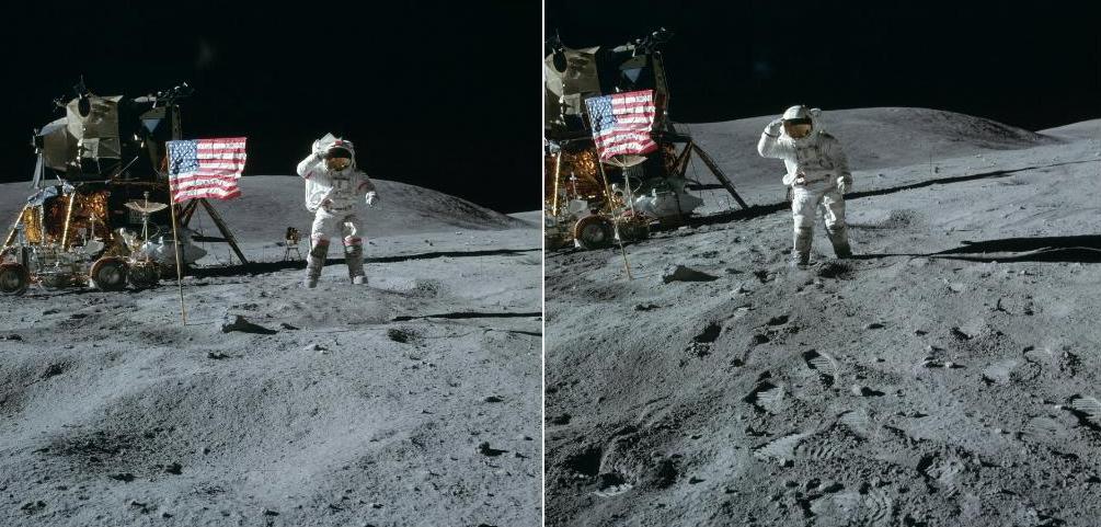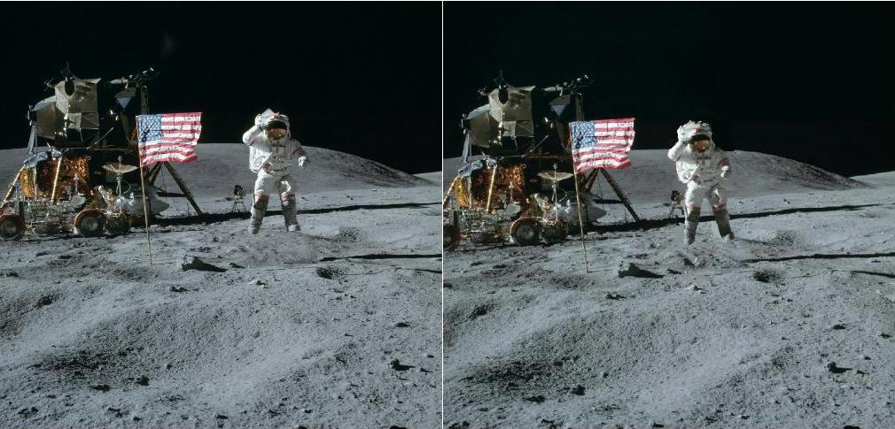 This animation is made with the photo AS16-113-18339 and the original photo AS16-113-18340 (i.e. the astronaut not falling vertically the second time). |