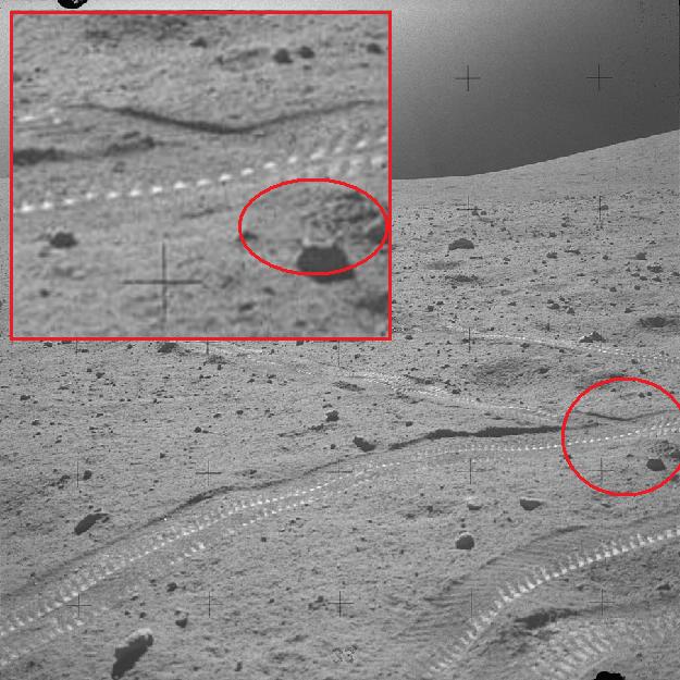 ![]() There is a slight rotation of the camera relatively to the previous photograph. If we consider the orientation of the lem's shadow (I have outlined it in yellow), and also the fact that we see more of the hill I have circled in yellow, this rotation is clockwise. But if we attentively look at the artifacts in the background near the hill (I have circled them in red, and I show a close-up of them in a window bordered with red), they show an counterclockwise rotation of the camera, that is a rotation which is opposite to the previous rotation! It must be a lunar rotation! |