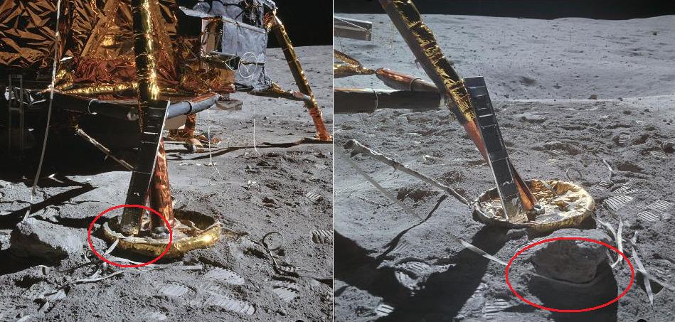 ![]() On photo AS16-107-17441, a white ribbon passes over the Lem's foot. But on photo AS16-107-17442, the same ribbon passes behind a rock which is near the Lem's foot instead! |