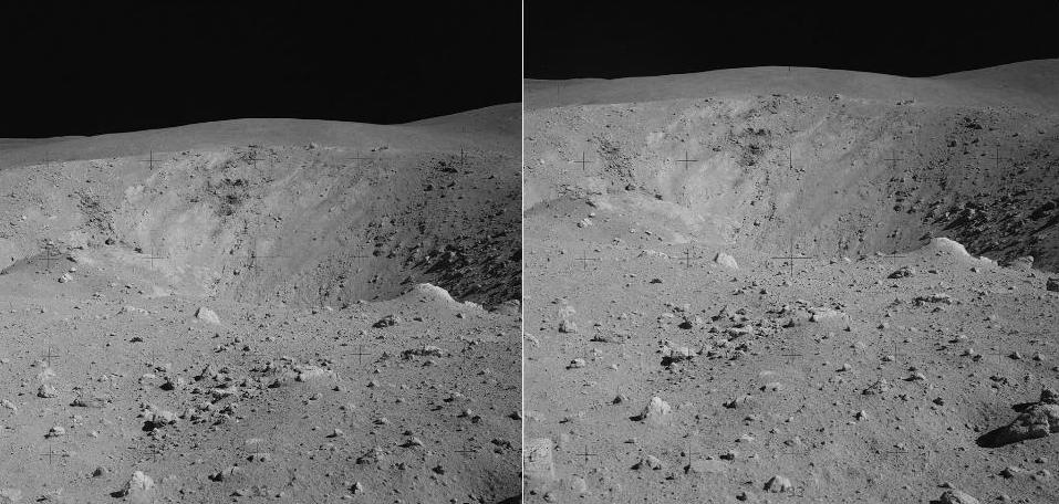 ![]() On this double view, I have corrected the astronaut on photo AS16-113-18340 (the photo on the right) to give him the same orientation as the one he had on photo AS16-113-18339 (the photo on the left). |
