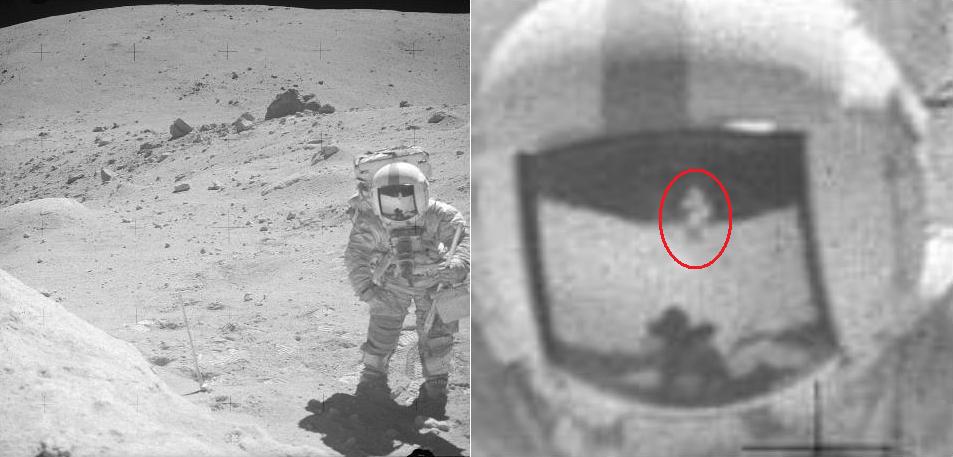 ![]() If we look in the visor of the astronaut on the three photos, we see strange things. On the left I identify what seems to me the paw of an animal (a tiger's paw?). There is also a strange face, a lunar face I should say! |