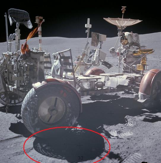 ![]() On photo AS16-109-17391 (right), the horizon line has rotated relatively to the previous photo AS16-109-17390 (left), but the direction of the rover has not changed, and the position of stones in the close foreground relatively to the rover has not changed either, which shows that the photographer has not moved. A new example of background rotating and foreground not rotating, a classic of the fakers. |