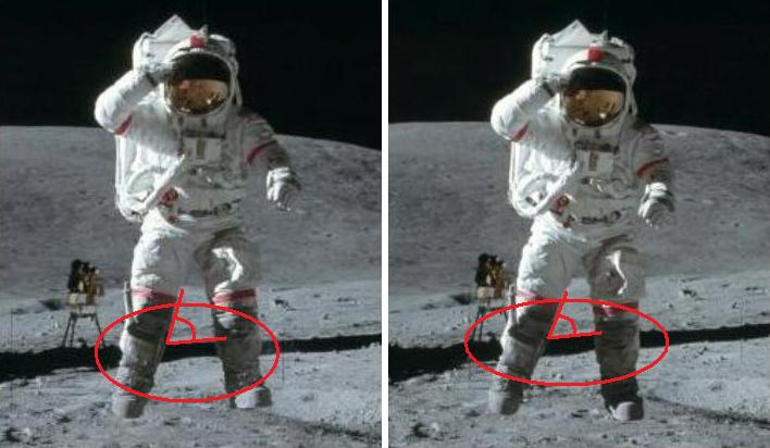 ![]() On photos AS16-114-18422 and AS16-114-18423, the direction of the sunlight changes importantly, whereas the camera keeps aiming at the same direction. The photo AS16-114-18423 is famous because the astronaut has his shadow ahead of him and is in the same time brightly lit. The NASA contends that it comes from the lunar reflectivity! But we know better of course. It simply comes from the fact that the sun-projector is very close to the scene and diffuses its light in all directions. ![]() On photo AS16-114-18423 there is an object behind the astronaut's backpack of which we see the shadow (circled in red) but its shadow is too low, for it is much below the shadow of the elbow, but, on the photo, it's above this elbow ![]() On the same photo we can see in the visor that the astronaut lifts his left arm whereas this arm is in fact lowered as much on the photo as on the shadow. The orientation of the hand of this arm on the shadow is incorrect. |