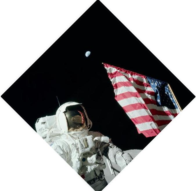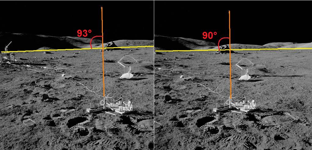![]() We here have two photos of the astronaut near the flag (AS17-134-20381 and AS17-134-20382). Between the two photos, the photographer has moved on the right; this is visible for the flag has moved on the left relatively to rover and the Lem. ![]() On this pair of photos of a bike taken before cars, on the second photo I have moved on the right. This is visible for the bike has moved on the left relatively to the cars which are behind. On the second photo the bike shows an optical clockwise rotation caused by my lateral move on the right. ![]() Now I can manually apply an counterclockwise rotation to the bike in order to compensate the optical clockwise rotation, so that the bike has the same orientation on the two photos. ![]() On this double view, we should see an optical rotation of the flag on the second photo in reason of the move on the right of the photographer. ![]() In fact, we should see an optical clockwise rotation of the flag on the second photo like on this view I corrected. ![]() The flag could only keep its initial orientation on the second photo if a manual counterclockwise rotation was applied to it in order to compensate the optical clockwise rotation caused by the lateral move of the photographer. |