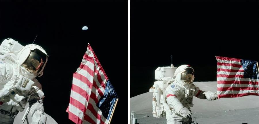 ![]() On photos AS17-134-20378 and AS17-134-20508, you can see that the flag is not facing the same side of the LEM. It's a flag which likes to switch sides. |