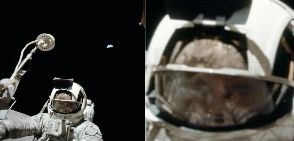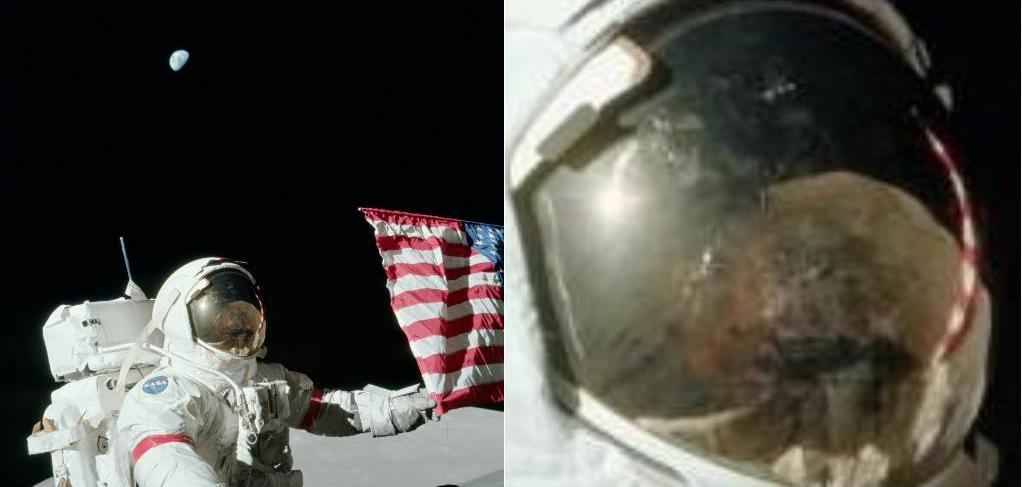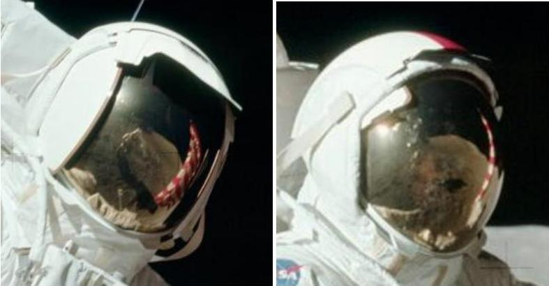 ![]() On photo AS17-134-20387, the reflection on the visor of the astronaut looks rather strange. |