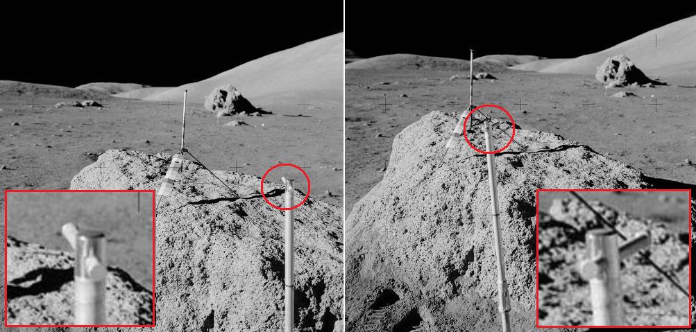 ![]() On the photo AS17-134-20489, we see the ALSEP in the foreground, and a rock, I have circled, in the background. On this photo, the ALSEP is facing the rock. ![]() On the photo AS17-136-20704, we also see the ALSEP and the same rock I have circled. We can see that the Alsep and the rock are viewed under a different angle, for they were vertically aligned on the previous photo, which is no more the case on this view. If we compare the ALSEPs of the two views, they appear to be different. ![]() In particular the cable I have highlighted in yellow is thicker on the second view, but it is not the only difference. Look at the items which are on it: They also appear to be different. And also look at the rocks of the two photos. They are not shadowed the same. ![]() The shadow of the rock of the first photo contains clear parts I have highlighted in yellow. I know what you are going to say: It is because the orientation of the sun is not the same on the two photos. On the first photo, the sun would be shining on the side of the rock, and, on the second photo, it would be shining on the back of it. ![]() But, if the sun is shining on the back of the rock in the second photo, then why does the bit I have highlighted in yellow produce the shadow I have highlighted in red? ![]() We don't even see this shadow on the rock of the first photo! ![]() Furthermore, on the moon, as much as I know, the space if 3D like on earth. So, to orient the antenna, they only need to turn the antenna around three axes, and, in order to do that, they normally only need three adjustment knobs. So, why do we see five adjustment knobs? ![]() The two knobs I have circled are most certainly useless and redundant...which does not mean that the other ones really allow to orient the antenna! |