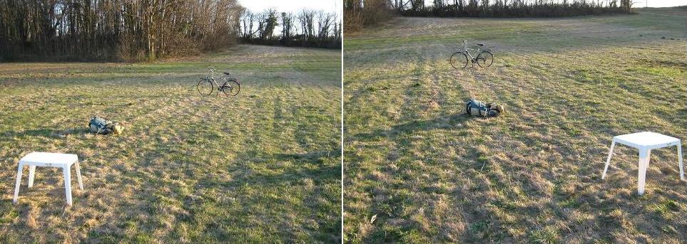 ![]() On photos AS17-140-21409 and AS17-140-21412, we have two different views of the rover. I have circled with different corresponding colors artifacts which are perfectly recognizable on the two views. ![]() On these views, I have made two triangles with artifacts; one with the artifacts of the upper part of the photo, and one with the artifacts of the lower part of the photo. And you can see that, whereas the triangle of the upper part shows hardly any rotation, the triangle of the lower part shows an important rotation. ![]() You can also see that the distance of an artifact (which was close to us on the first photo) to the rover changes importantly, much more than the size of the rover. ![]() I have made a little reconstitution, with my car symbolizing the rover, and a tile representing the stone I indicated on the Apollo photos. And you can see that, unlike the rover, my car shows a rotation, and that its size decreases more on the second photo (whereas in fact the tile is a little less close to the car than the stone to the rover on the Apollo photo). |