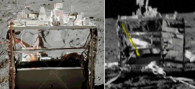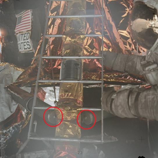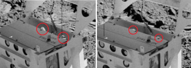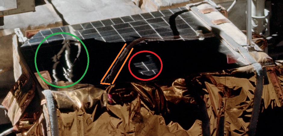 ![]() On photos AS17-141-21510 and AS17-141-21511 we have two views of the SEP transmitter. ![]() But, if we take a close-up, we can see holes (I have circled in red) on the first view which appear much bigger than on the second view; yet the perspective doesn't appear so different. ![]() But in fact this is not the strangest part. The strangest part is the weird shadow of the SEP transmitter. It's outright impossible; and it can't be the shadow of something which is placed behind the photo because of the orientation of the shadow. |