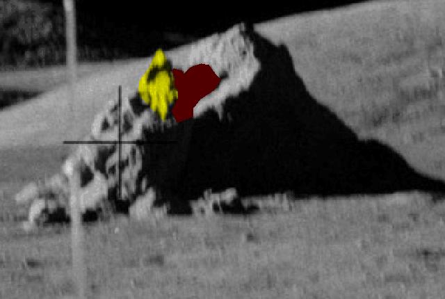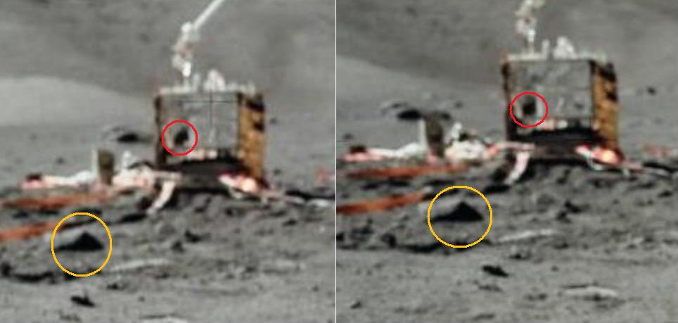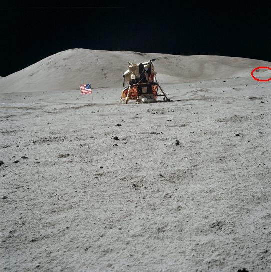 ![]() On photos AS17-139-21203 and AS17-139-21204, we have two large views of a lunar landscape with the LEM in the distance. Something told me I would find something different on the two photos, and you know what? I found it! It's on the zone I have circled in red. ![]() On the close-ups, you can see that there is a black spot which has moved from one hill to the other. |