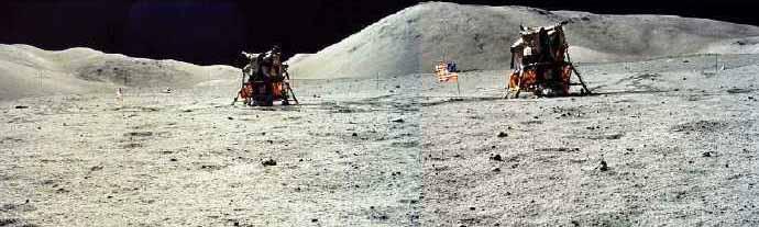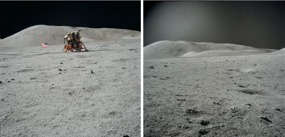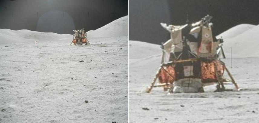 ![]() In Apollo 17, there are plenty of photos on which the lunar module is visible, but I'll retain three of them. This one, AS17-134-20447. ![]() This one, AS17-134-20448. ![]() And this one, AS17-137-20874 (with the following one, AS17-137-20875). Now, let's compare the two first photos, AS17-134-20447, and AS17-134-20448. On them the lunar module is seen under different angles. I have circled in yellow the same leg on each of the views. On the second photo (right of the double view), I have circled a hole which is close to the lunar module. On the first photo (left of the double view), I have circled the corresponding region in which we should see the same hole...but we don't find it in this region. Of course, I have looked on the high definition version of the photo. Now let's compare the photo AS17-134-20447 with the photo AS17-137-20874. On these photos the lunar module is also seen under two different angles. I have circled in yellow the rear panel of the lunar module on the two photos; and I have circled in orange the leg which is under this panel. I now use the following photo, AS17-137-20875; I have circled on it, in yellow, the same leg, and, in red, a rock which is close to the lunar module. On the first photo (left of the double view), I have circled in red the region in which we should find the same rock...but we don't find it in this region! Of course, I have also looked on the high definition version of the photo. We find a rock not far, but, not only it is not positioned the same relatively to the lunar module, but furthermore it is also shaped differently. |