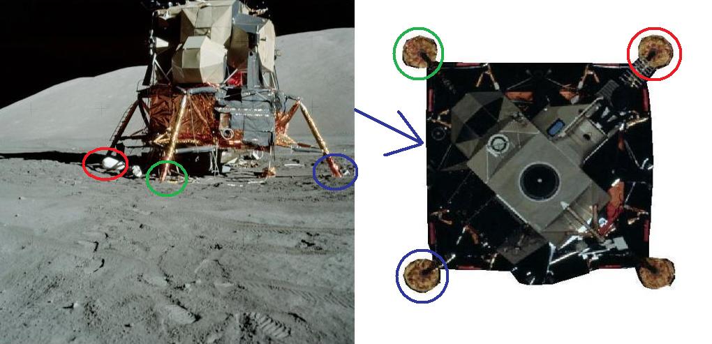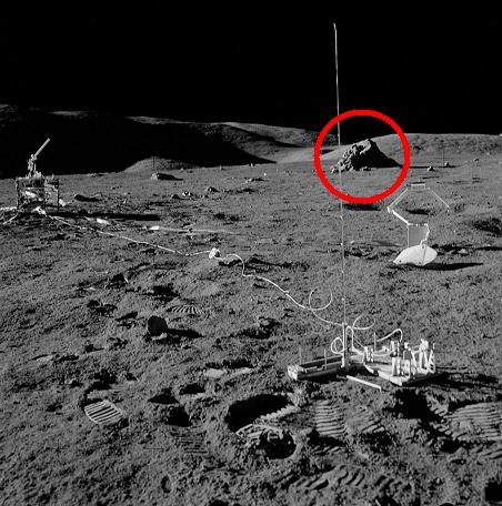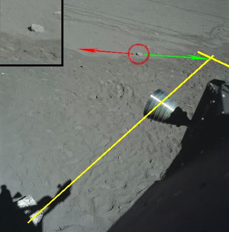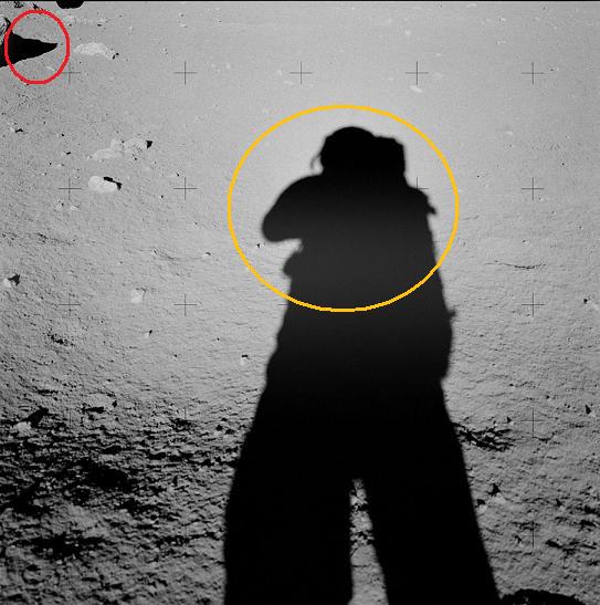 ![]() The photo AS17-145-22213 has been taken through the LM's window. On it, we can see the shadow of the radar antenna on the left bottom, and the flag's shadow on the top right; we don't see the flag itself completely, but we can see the bottom part of its flagpole. The directions of the shadows of the antenna and the flag are very different, but however it is not an anomaly. Indeed, you can find on the net photos of moon hoax debunkers showing unparallel converging shadows. However, these photos show a common fact: The directions of the shadows always meet on a common point, including the photographer's shadow (and the photographer's shadow is always vertical when the camera is held horizontally). ![]() On the photo, we can see a little rock I have circled; I show a close-up of it on the top left of the photo. Logically the shadow of this rock should be oriented toward the point of intersection of the directions of the shadows of the antenna and the flag...instead of that it is oriented practically in the opposite direction! |