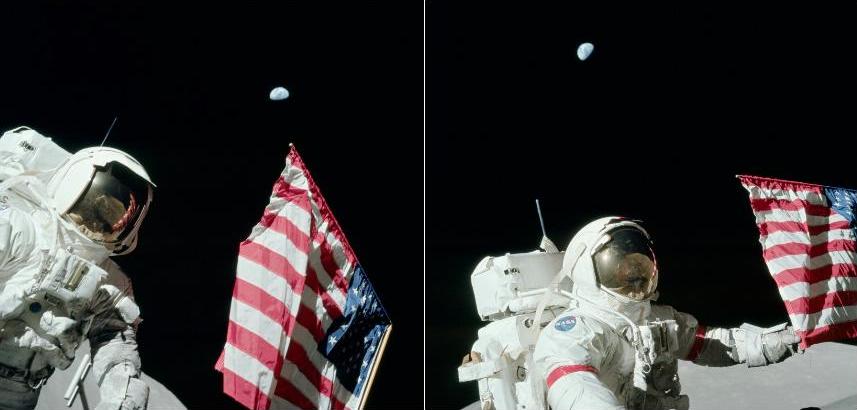 ![]() The photos AS17-134-20384 and AS17-134-20385 present two views of the two astronauts near the flag. ![]() But if we take a better look at the helmets on the two photos, we can see they are very different. Why are their helmets so different? |