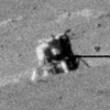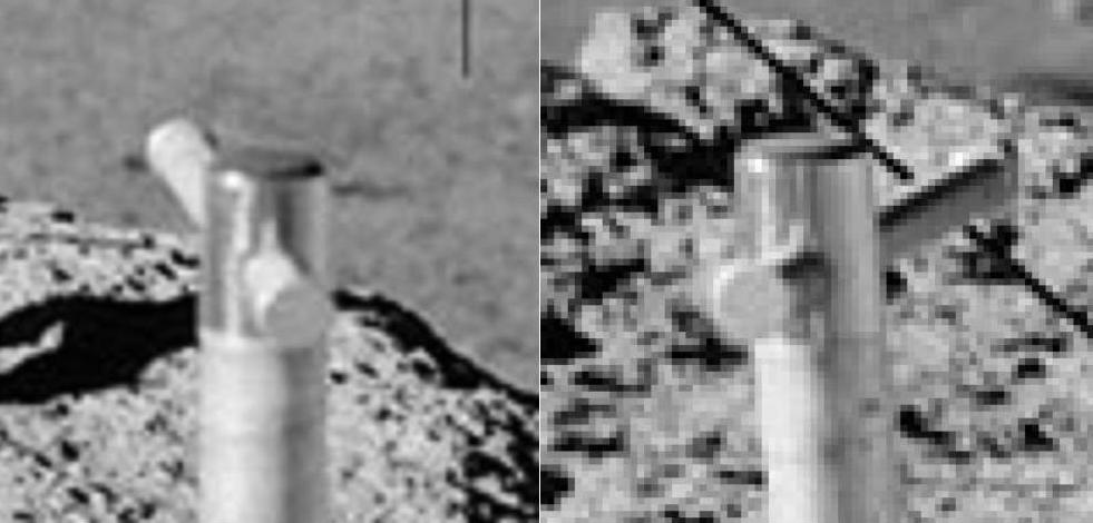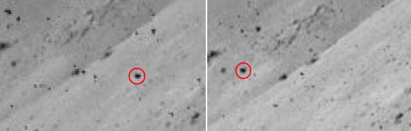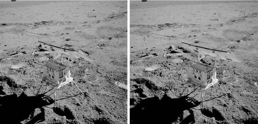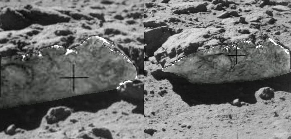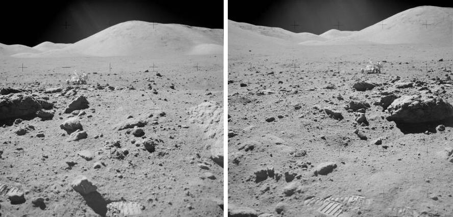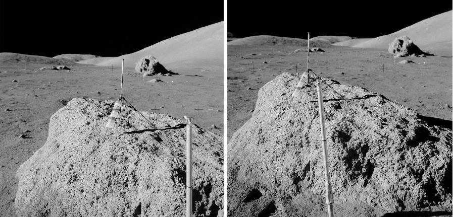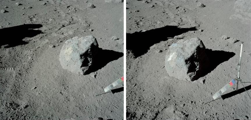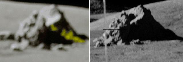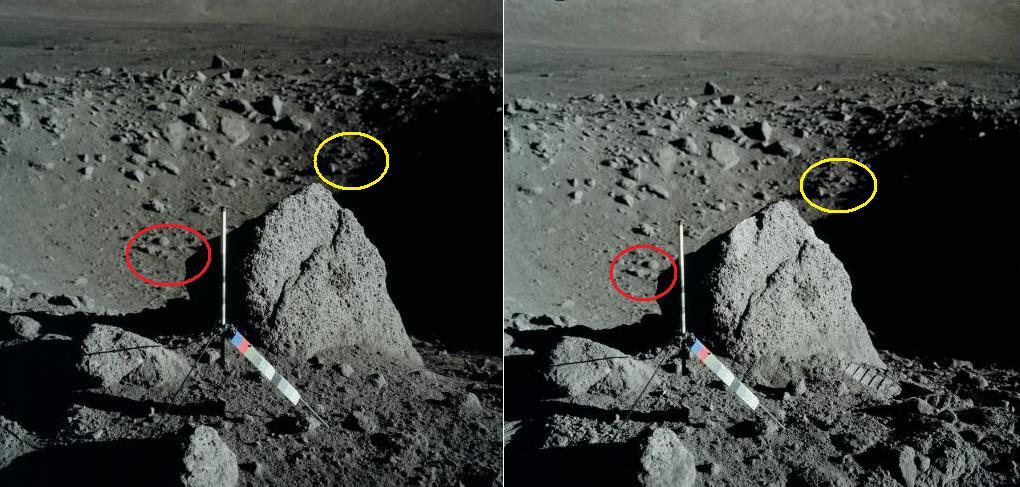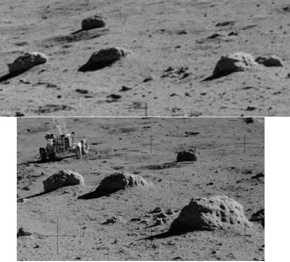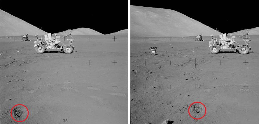 ![]() On the photo AS17-138-21039 (on the left), we see three rocks in the distance. On the photo AS17-138-21048 (on the right), we see them again, but closer, and under a different perspective. ![]() If we compare a close-up of the rocks on the first view with the rocks of the second view, we can see that the artifacts which are near them are different. If we make an animation with the two views of the three rocks, it makes a funny impression. |