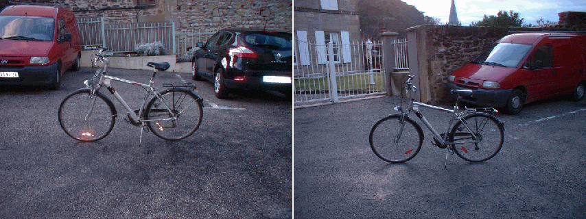 When the photographer simply turns his camera without moving, the foreground and the background move the same; an object in the foreground will not move relatively to the background, and shows no rotation either. The white van on the parking lot does not move relatively to the house in the background, and shows no rotation either. But, on the other side, if the photographer moves, the objects in the foreground will move relatively to the background on one hand, and will also show a rotation on the other hand. On the photo of the left, I am taking a photo of my bike before cars; on the photo of the right, I have moved right, and the bike moves left relatively to the cars and the grid behind, and also shows a rotation. On this new double view, I have manually turned my bike counterclockwise before moving on the right, and the bike on the second photo shows the same orientation as on the first photo, because the manual (counterclockwise) rotation compensates the optical (clockwise) one. From the photo AS17-134-20509 to AS17-134-20513, an astronaut takes a series of photos of the flag and the LM with a hill in the background. As he takes these photos, he gradually moves on the left; the result is that the flag moves right relatively to the LM, because it is closer to the astronaut than the LM, on one side, and that the LM itself moves right relatively to the hill because it is closer to the astronaut than the hill, on the other side. If we make an animation with close-ups of the lunar module on these photos, we can see that the lunar module shows a counterclockwise rotation, which is totally normal since the astronaut moves on the left as he takes the photos. The flag should also show a rotation, and a more important one, since it is closer to the photographer. As the flag moves as much relatively to the LM as the LM does relatively to the hill, the rotation of the flag should even be double of the one of the LM. But, if we make an animation with close-ups of the flag, the flag shows almost no rotation on it... ...at least much less consistent than the one of the LM, when it should be twice more important! |