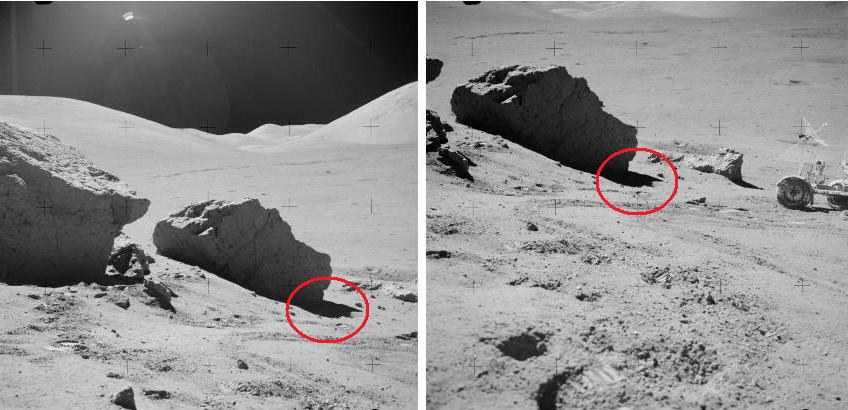 ![]() Here on AS17-141-21596 and AS17-141-21597, we have the same condition of sunlight and the same perspective, and yet the shaded parts of the rocks appear darker on one photo than on the other. Apollo fans have told me that the photos could have been taken at very different moments (although their sequence numbers are close), and that therefore the sunlight could have changed between the two photos. But it's easy to go around this argument; look at the rock's shadow on the two photos: it has exactly the same size and orientation on the two photos; this undeniably proves that the sunlight has not changed! |