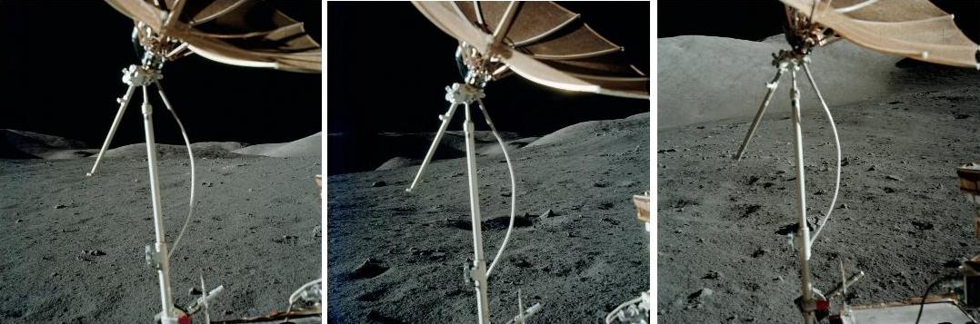![]() Between photos AS17-136-20704 and AS17-136-20705, the photographer turns his camera on the right, but he also moves the left; it's visible because the antenna of the ALSEP moves on the right relatively to a rock in the background. ![]() Logically, as the photographer has moved on the left, the antenna of the ALSEP should have rotated clockwise relatively to the horizon line; but it's the converse, it has rotated counterclockwise! |