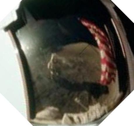![]() On the same photo, I also show that the photographer's shadow cuts the lower end of the flag in the visor's reflection, but not on the photo. ![]() Now, if you don't see it, I show you a close-up with an increase of brightness which should allow you to see it. |