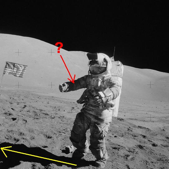 ![]() On photo AS17-143-21941, by the direction of the astronaut's shadow we know the direction of the sunlight; thence the inner side of his right arm is obviously exposed to the sunlight, and it can't be shaded by the left arm for the astronaut is stretching his right arm higher than his left one. So how can his right arm appear shaded on the photo??? |