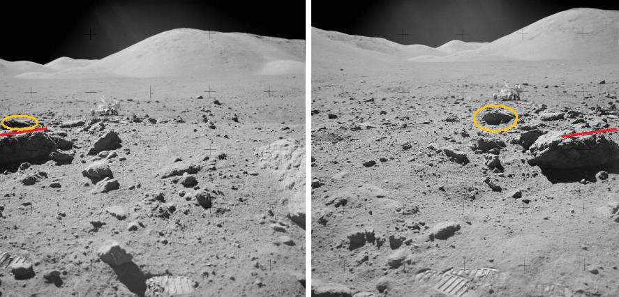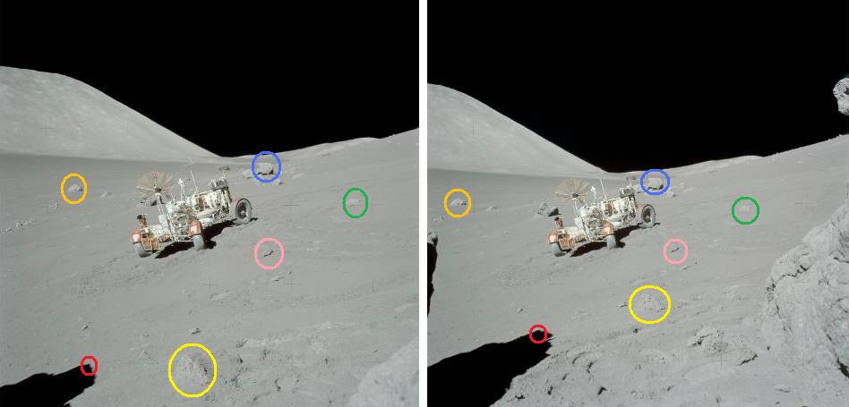 ![]() On the photos AS17-136-20714 and AS17-136-20715, we have two views of a big rock in the foreground, and other rocks and the hills in the background. Between the two views, the photographer has moved back and on the right, and also turned his camera on the left and down. What we see on the two views is coherent with these actions of the photographer. |