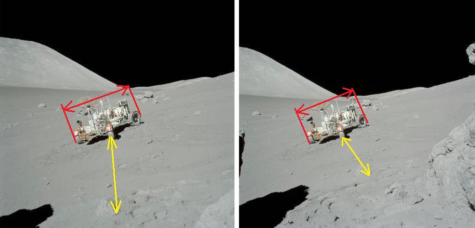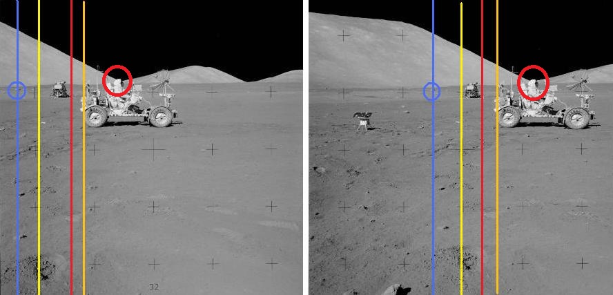 ![]() On photos AS17-141-21512 and AS17-141-21513, The photographer turns his camera on the left, but he also moves a little on the left: Indeed, we can see that the hole in the close foreground has moved on the right relatively to the background. ![]() The rover has also moved slightly on the right relatively to the lem and the hills, but of course less than the hole in the close foreground. But there is a rock which is farther than the lem which has also moved on the right relatively to the lem; yet, as it is farther than the lem, it should have moved on the left instead (relatively to the lem), or at least not moved if the lem is far enough not to react to the move of the astronaut. ![]() And also the head of the astronaut is exactly on the bottom corner of the hills in the background; on the second photo, it should have moved on the right relatively to this bottom corner. |