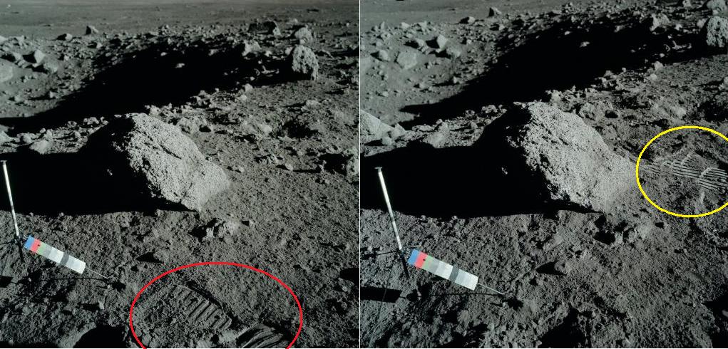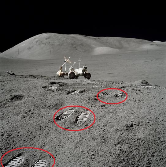 ![]() On the photo AS17-134-20399, there are new footprints (circled in yellow) which are not on photo AS17-134-20398. But the footprints which were on the photo AS17-134-20398 (circled in red) are no more on the photo AS17-134-20399. The footprints are short lived on the moon! |
