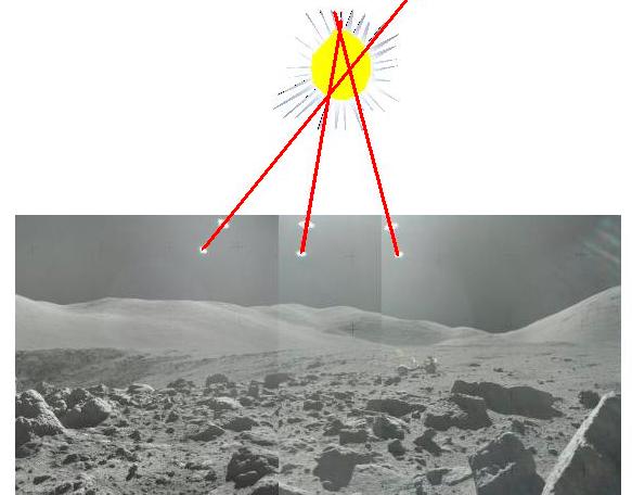 ![]() On the photos AS17-145-22160, AS17-145-22161, and AS17-145-22162, the astronaut is sweeping a landscape by turning his camera. What I'm showing here is a panoramic reconstituted with these three photos. On each photo, we find two small sun reflections indicating the direction of the sunlight; the sun is normally just above the upper edge of the photo and aligned with these reflections. The panoramic allows a comparison of these reflections. ![]() Normally the center of the sun would be on the intersection of the lines of reflections, but it would put the sun way too far from these reflections when it should normally be near them; furthermore these lines don't even meet on a common point. ![]() In fact each of the lines of reflections indicates a different position of the light source which is supposed to replace the sun; I have numbered these positions 1 to 3. Between the photos the "sun" has been moved. |