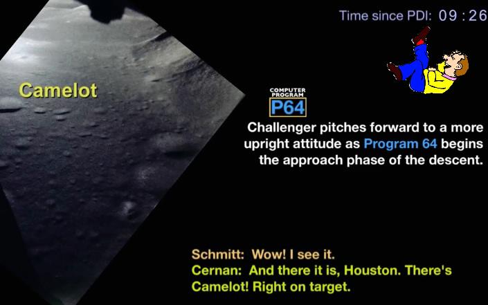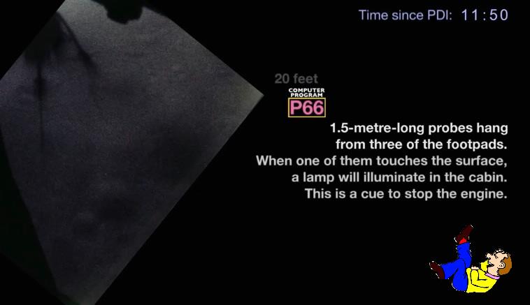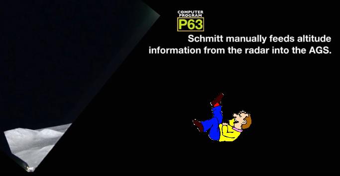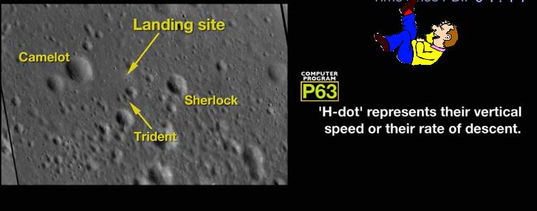 ![]() Ils disent: "Delta-H compare le PGNS avec le radar d'alunissage. Alors que le Radar détecte des montagnes à l'est du site, cela affecte le Delta-H, un bon signe que cela marche bien." C'est une bonne plaisanterie: Delta-H mesure une variation de distance verticale au sol lunaire, et les montagnes détectées ne sont pas à la verticale du module lunaire. |