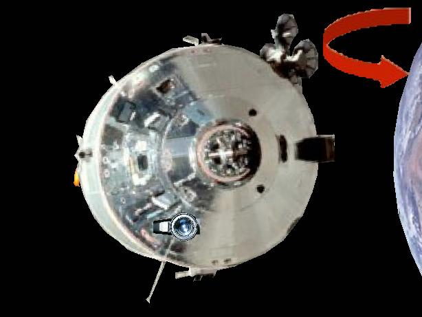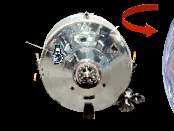 ![]() The CSM has two sets of lateral engines perpendicular to each other (the CSM I show here comes from Apollo 11). That means that the rotational plane can be in the plane of vision of the camera, but also perpendicular to it. Moreover the lateral engines can fire in both directions, which allows the CSM to turn in both directions. I represent the camera so that it is well visible (oversized and outside the CSM). In fact we can have different cases that I am going to present. |