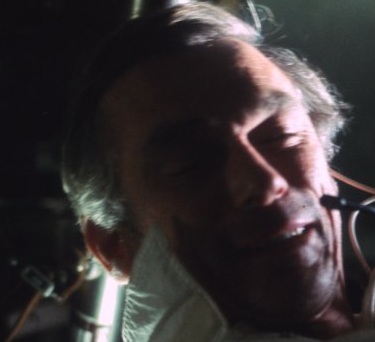 ![]() See this close-up of the command's module pilot, Evans on the photo AS17-163-24114. He is taken in photo, and he does not even look at the camera. See the swollen vein on his forehead, he is under a strong stress. |